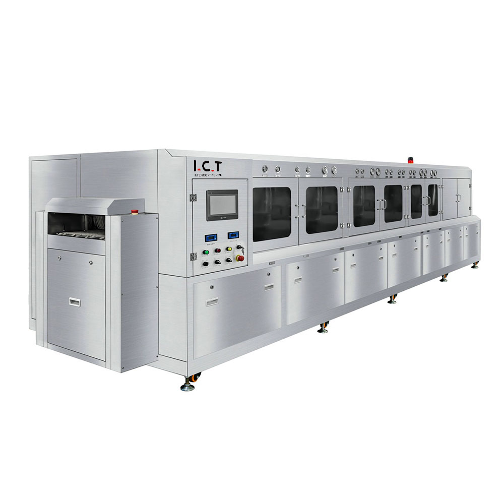 ИЦТ-5600 може аутоматски завршити цео процес чишћења, испирања и сушења једним кључем кроз систем прскања који може подесити притисак. Соба за чишћење садржи два слоја кошара за чишћење, што може чистити више плоча одједном. Темељито и ефикасно чисте органске и неорганске загађиваче као што су Росин, не-чисти ток, ток растворљив у води и други органски и неоргански загађивачи на површини СМТ / ТХТ ПЦБА након лемљења. Цирцулирајући систем филтрације раствора за чишћење може више користити решење за чишћење и смањити отпад раствора за чишћење.